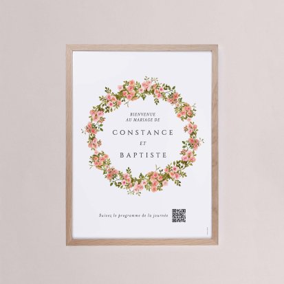 Grâce à la pancarte de bienvenue, vos convives comprennent rapidement ce qu'ils doivent faire pendant la cérémonie et pendant le repas du mariage. L'affiche peut se décliner en :
