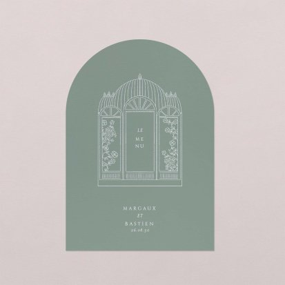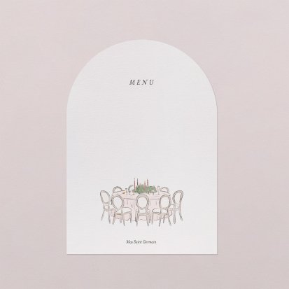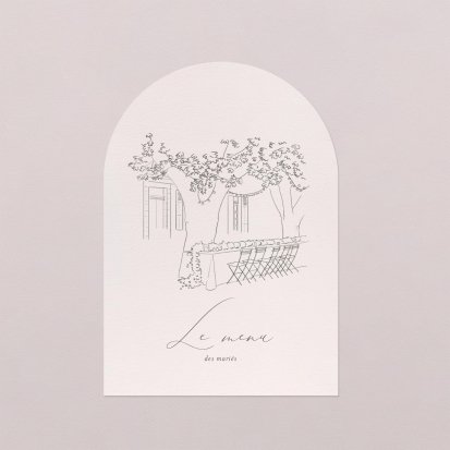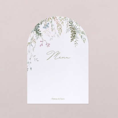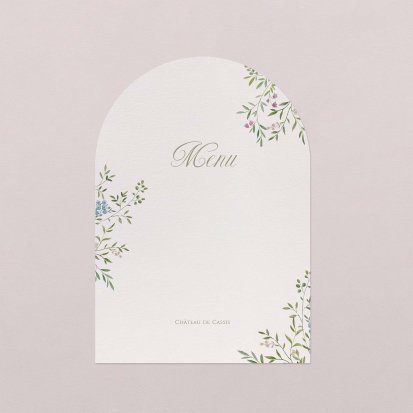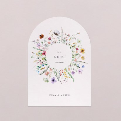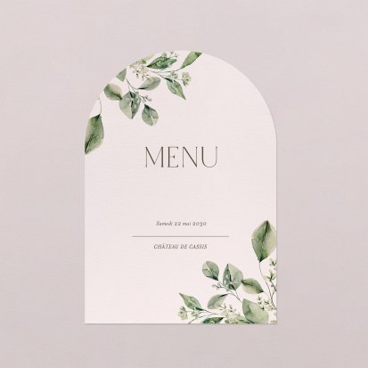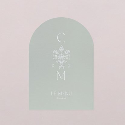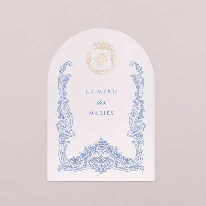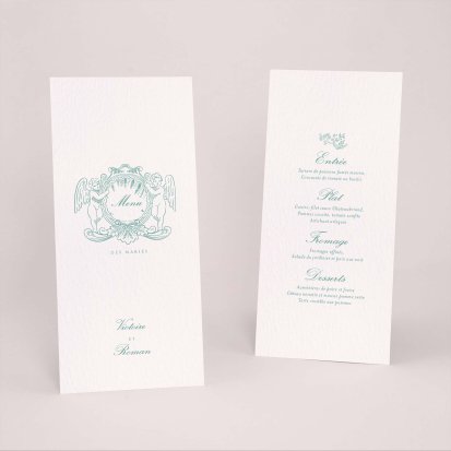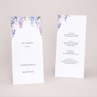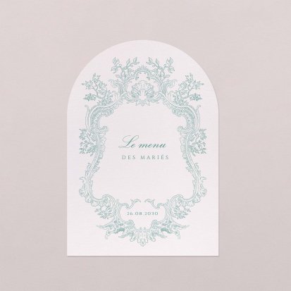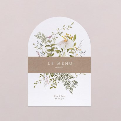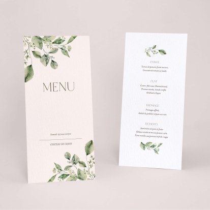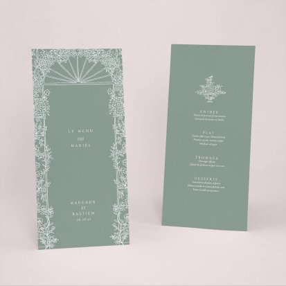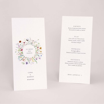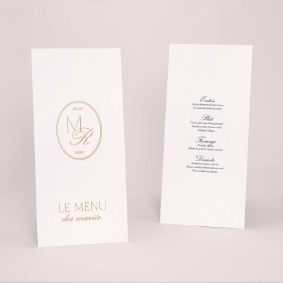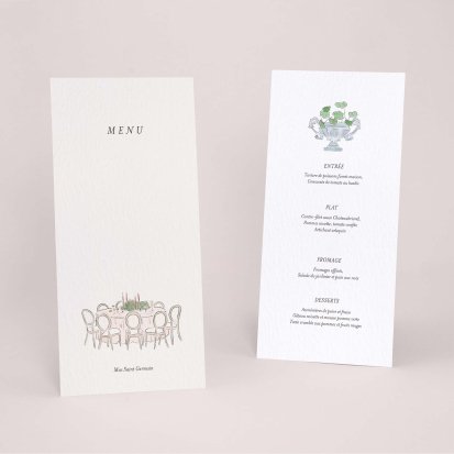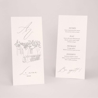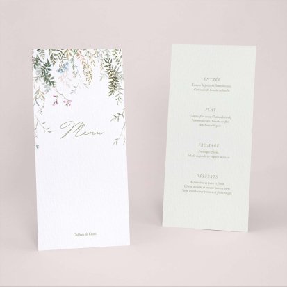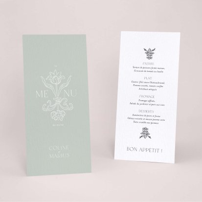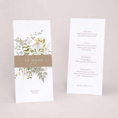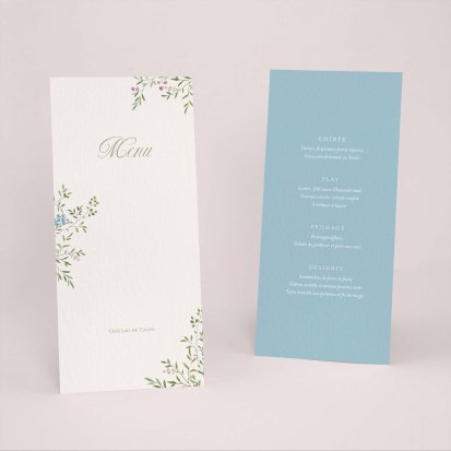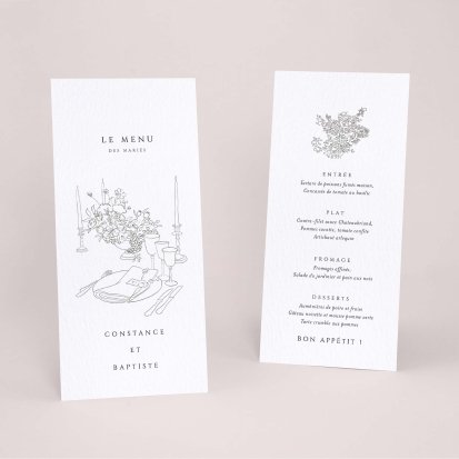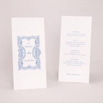 Faites-le imprimer sur nos menus assortis à votre faire-part ! Posés sur chacune de vos tables, ils viendront compléter votre décoration et vos invités repartiront avec un souvenir de ce merveilleux repas. Nous vous conseillons de le placer joliment au centre de l'assiette accompagné du marque-place.
