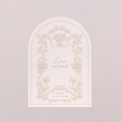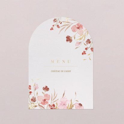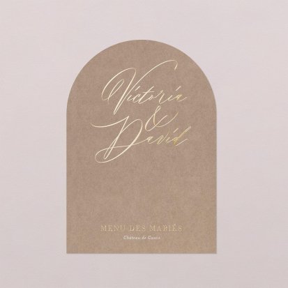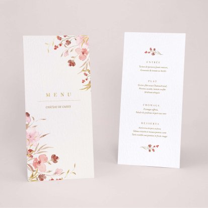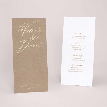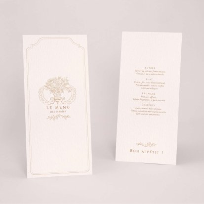 Pour apporter une note d’élégance supplémentaire à vos menus de mariage, choisissez un modèle orné de finitions dorées, cuivrées ou vernis.