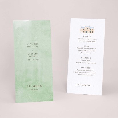 Déposé sur les tables dans la salle de réception, le menu de mariage personnalisé est avant tout un guide pratique pour les invités. Entrée, plat, dessert, fromages, repas à table ou buffet : ce menu dévoile tous les détails utiles aux invités pour ce moment clé de la soirée.