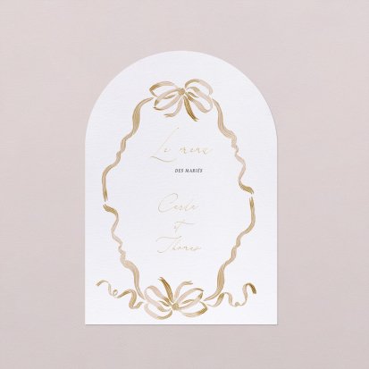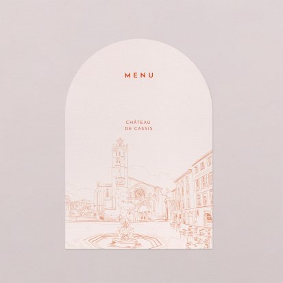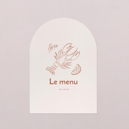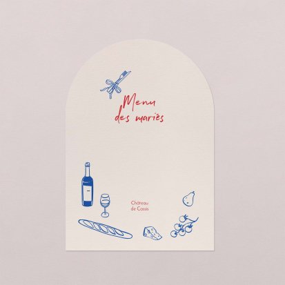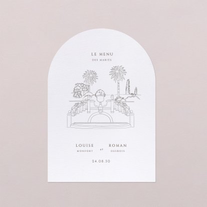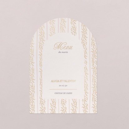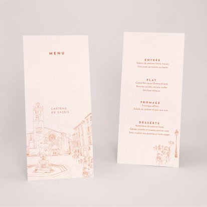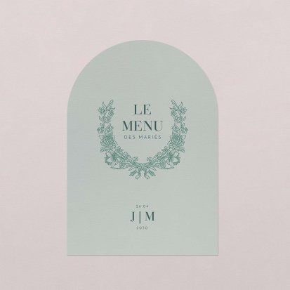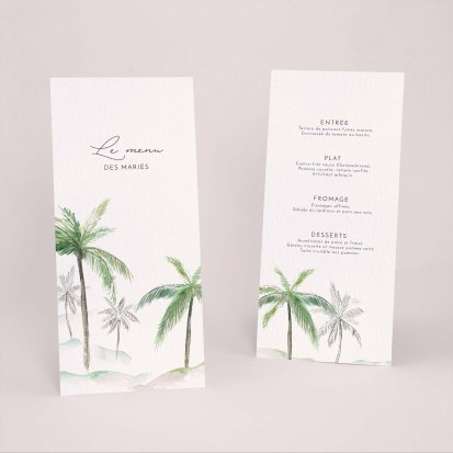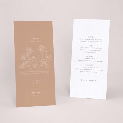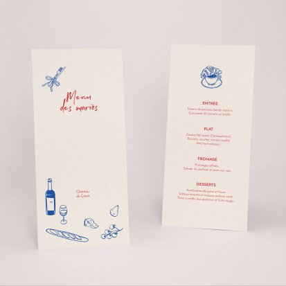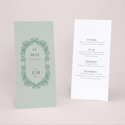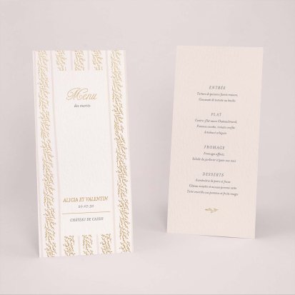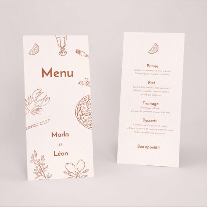 Faites-le imprimer sur nos menus assortis à votre faire-part ! Posés sur chacune de vos tables, ils viendront compléter votre décoration et vos invités repartiront avec un souvenir de ce merveilleux repas. Nous vous conseillons de le placer joliment au centre de l'assiette accompagné du marque-place.
