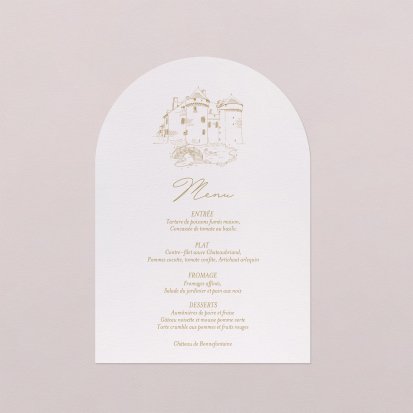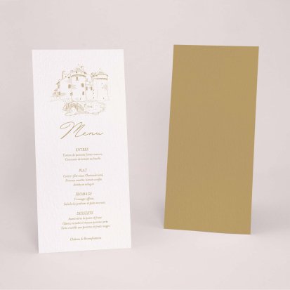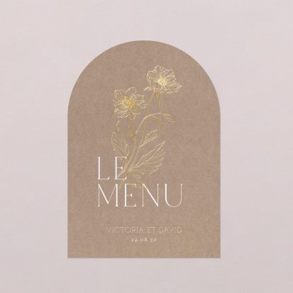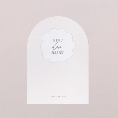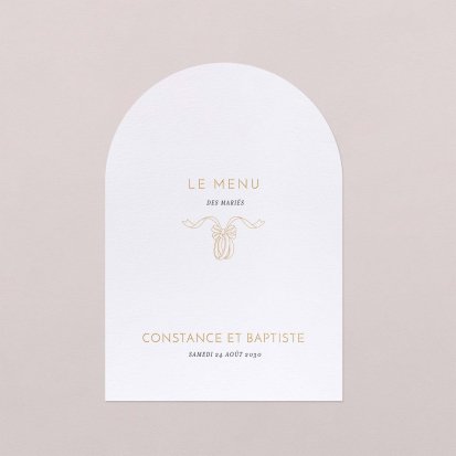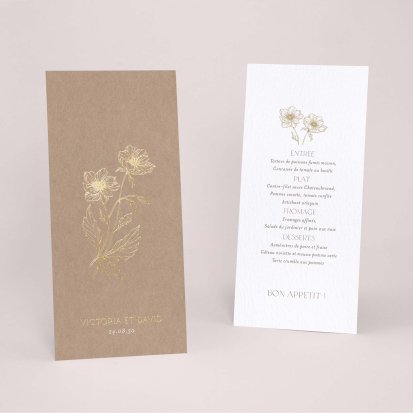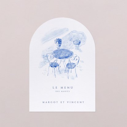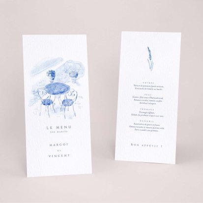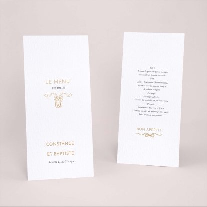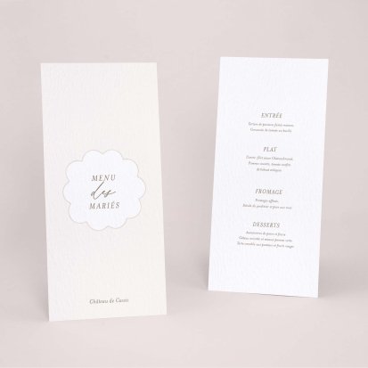 Faites-le imprimer sur nos menus assortis à votre faire-part ! Posés sur chacune de vos tables, ils viendront compléter votre décoration et vos invités repartiront avec un souvenir de ce merveilleux repas. Nous vous conseillons de le placer joliment au centre de l'assiette accompagné du marque-place.