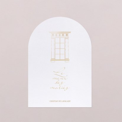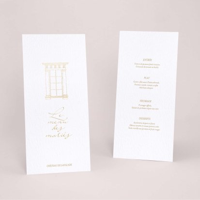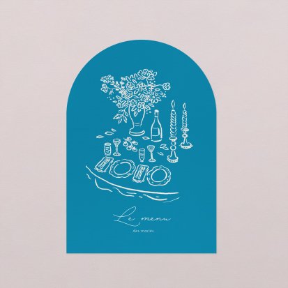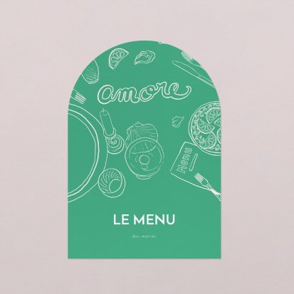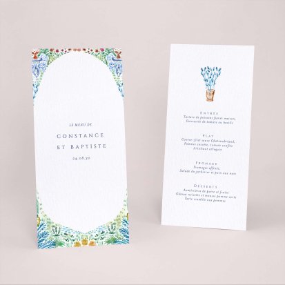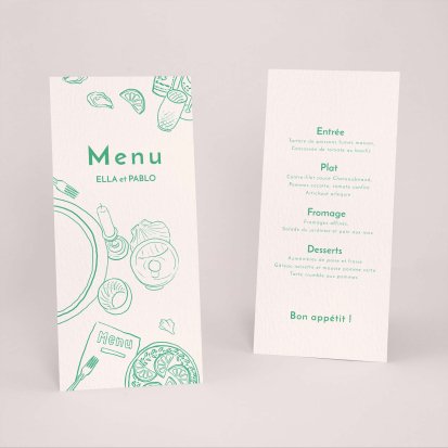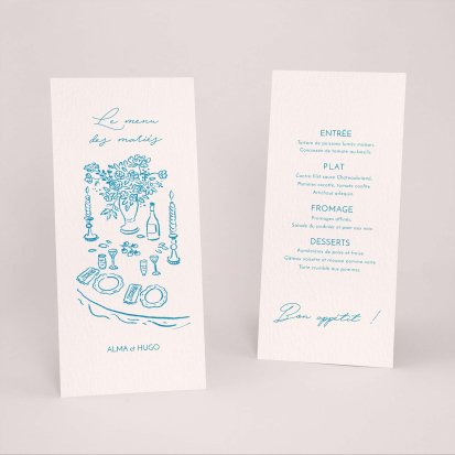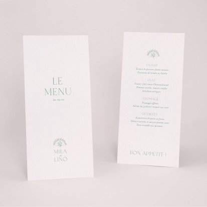 Faites-le imprimer sur nos menus assortis à votre faire-part ! Posés sur chacune de vos tables, ils viendront compléter votre décoration et vos invités repartiront avec un souvenir de ce merveilleux repas. Nous vous conseillons de le placer joliment au centre de l'assiette accompagné du marque-place.