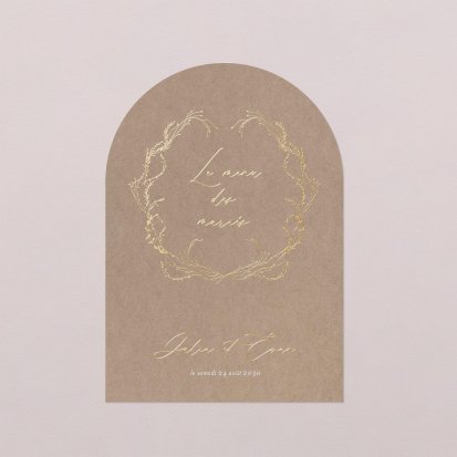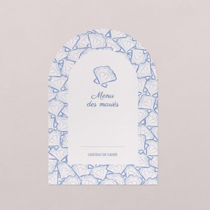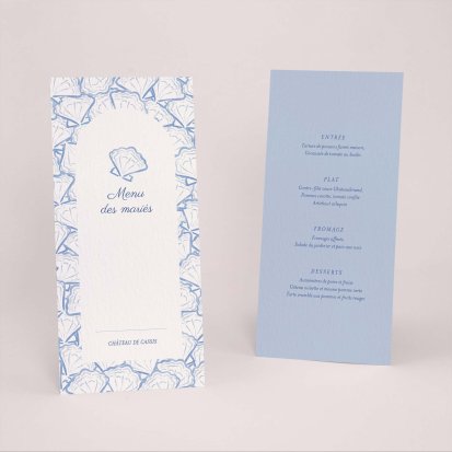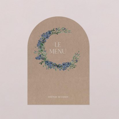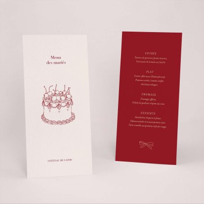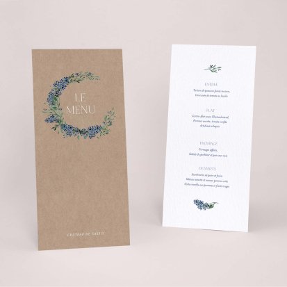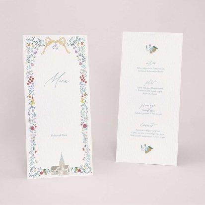 Faites-le imprimer sur nos menus assortis à votre faire-part ! Posés sur chacune de vos tables, ils viendront compléter votre décoration et vos invités repartiront avec un souvenir de ce merveilleux repas. Nous vous conseillons de le placer joliment au centre de l'assiette accompagné du marque-place.