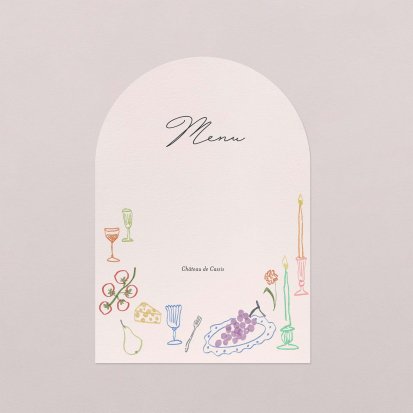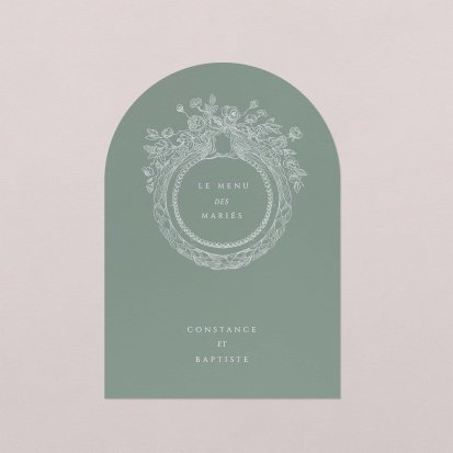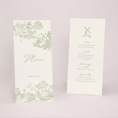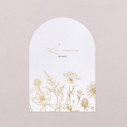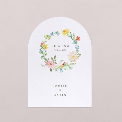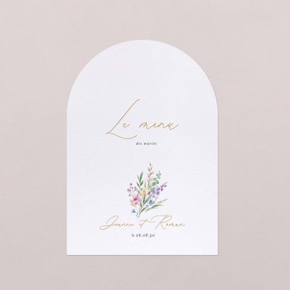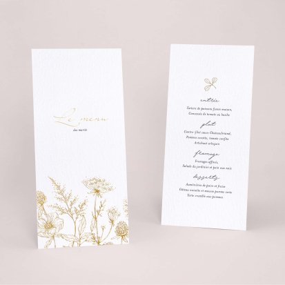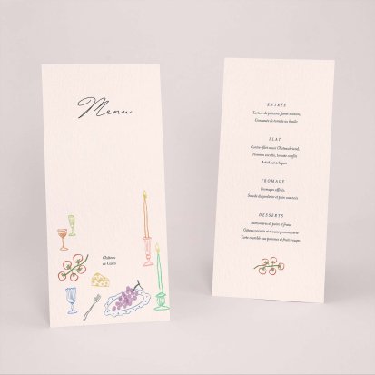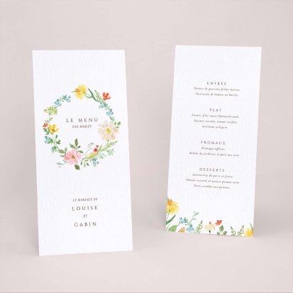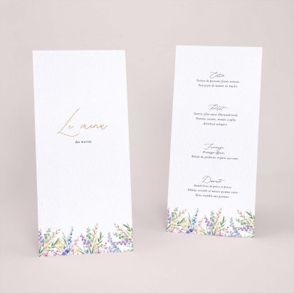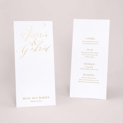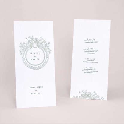 Faites-le imprimer sur nos menus assortis à votre faire-part ! Posés sur chacune de vos tables, ils viendront compléter votre décoration et vos invités repartiront avec un souvenir de ce merveilleux repas. Nous vous conseillons de le placer joliment au centre de l'assiette accompagné du marque-place.