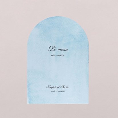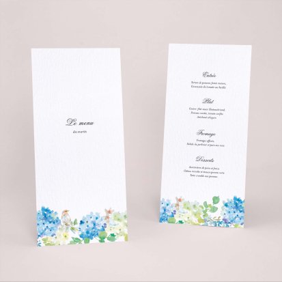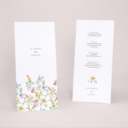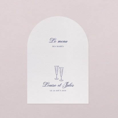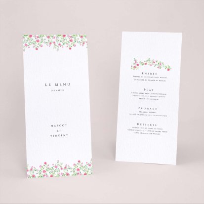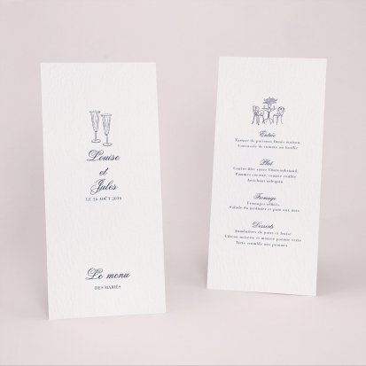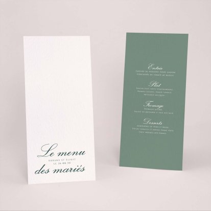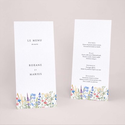 Faites-le imprimer sur nos menus assortis à votre faire-part ! Posés sur chacune de vos tables, ils viendront compléter votre décoration et vos invités repartiront avec un souvenir de ce merveilleux repas. Nous vous conseillons de le placer joliment au centre de l'assiette accompagné du marque-place.
