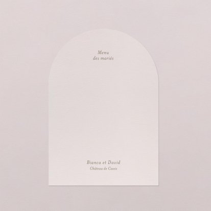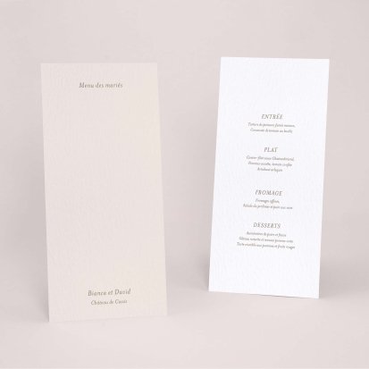 Faites-le imprimer sur nos menus assortis à votre faire-part ! Posés sur chacune de vos tables, ils viendront compléter votre décoration et vos invités repartiront avec un souvenir de ce merveilleux repas. Nous vous conseillons de le placer joliment au centre de l'assiette accompagné du marque-place.