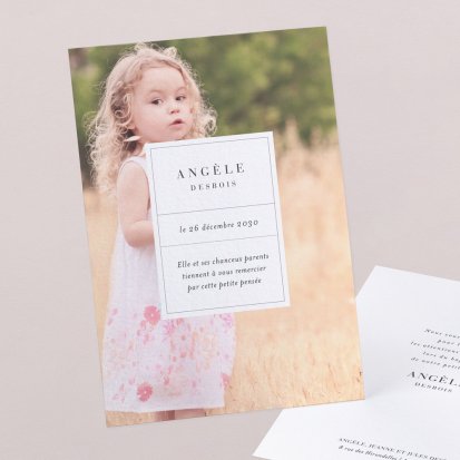 Sur vos cartes de remerciement, vous conseillons d'écrire le nom de votre enfant, la date de baptême et éventuellement le lieu de l’évènement. Vous pouvez également y ajouter votre adresse postale.