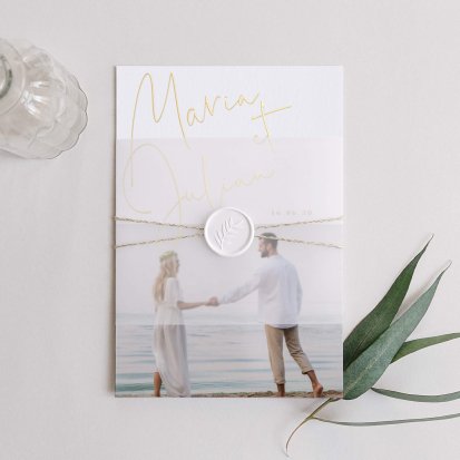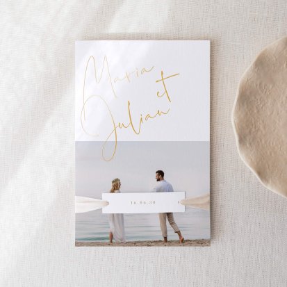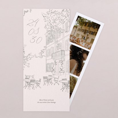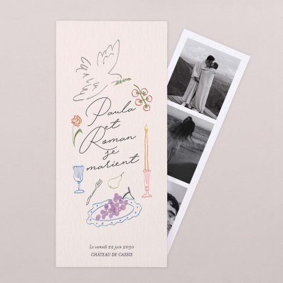 Si vous souhaitez ajouter cette touche personnelle à votre faire-part de mariage, choisissez des clichés souvenirs de vacances en amoureux ou une photo de vous deux au quotidien.