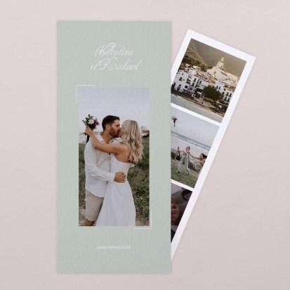La photo sur votre faire-part de remerciement fera forte impression auprès de vos invités ! Ceux-ci se rappelleront ce beau moment passé ensemble. Ils auront envie de garder votre carte de remerciement dans une boîte à souvenirs ou de l’accrocher sur un mur photo.