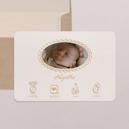 Nos créatrices proposent des dessins attendrissants pour évoquer l'univers de bébé. Les fleurs envahissent de nombreux modèles avec des roses et d'autres bourgeons de toutes les couleurs. Les objets du nourrisson sont souvent évoqués sur les illustrations : jouets, langes, peluche, etc. Les parents adorent la représentation minimaliste de leur foyer en lignes délicates avec un couple portant leur bébé dans les bras. Peut-être préférez-vous des finitions dorées ou cuivrées pour offrir un aspect luxueux au faire-part de naissance de votre enfant.