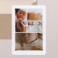 Sur le faire-part de naissance photo Sweet baby, plusieurs photographies de votre enfant s'invitent au cœur d'une composition douce et raffinée. Ce modèle au design élégant présente avec tendresse les détails clés de la naissance de bébé, sublimés d'une délicate finition dorée. Une création intemporelle, idéale pour les parents en quête d'un faire-part à la fois simple et précieux.
