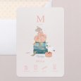 Sur le faire-part de naissance Entrechat, une adorable souris trône au sommet d'une pile de valises.