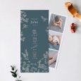 Nichées au coeur de notre Forêt endormie, les informations clés de votre bébé seront appréciées par vos êtres chers. Puis, en ouvrant ce faire-part de naissance au majestueux bleu agrémenté de détails raffinés, l'effet de surprise opérera avec la découverte de votre petit bout immortalisé sur des précieuses photos. Un modèle empreint de charme et d'élégance à conserver en souvenir.