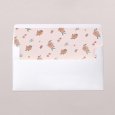 Sur le faire-part de naissance Scarlett, écureuil, lapin et oiseau jouent à cache cache au cœur d'un superbe tableau de fleurs oranges et roses. Une création joyeusement bohème, parfaite pour partager la naissance de bébé au printemps ou en été.