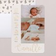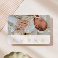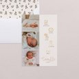 Délicat et élégant, le faire-part de naissance photo Tesoro met en lumière votre enfant. Le prénom de bébé est mis à l'honneur en lettrage cursif doré, accompagné d'adorables petites icônes illustrant les détails clés de sa naissance. Une création pleine de vie, parfaite pour célébrer le trésor que vous venez d'accueillir.