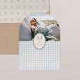 Avec son motif vichy emblématique, le faire-part de naissance Joli vichy - bleu partage tendrement, dans une composition aux teintes bleues délicates, la venue au monde de votre nouveau-né.