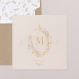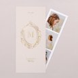 Sur le faire-part de communion Joli Boudoir, d'élégants ornements sublimés d’or encadrent l'initiale du prénom de votre enfant. Un modèle écrin aux courbes raffinées, qui reflètera le caractère d’exception de l’évènement célébré.