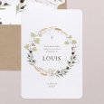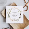 Orné d’une couronne d’épis de blé, de branches de vignes et d’oliviers, le faire-part de communion Rameaux sera parfaitement adapté à une fête dans un cadre champêtre.