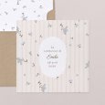 De délicates fleurs de myosotis bleues s'esquissent sur le faire-part de communion Myosotis. Une création poétique pleine de douceur, parfaite pour annoncer la communion de votre fille ou garçon au printemps ou en été.