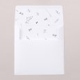 Faire-part en papier mat blanc, avec finitions relief et vernis au recto, agrémenté d'un élégant ruban au choix (et en supplément). Votre texte sera imprimé à l'intérieur du faire-part.