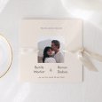 Ce faire-part se présente sous la forme d'une carte carrée pliée par le milieu. Les trois perforations vous permettront de glisser un joli ruban (au choix, en supplément) pour une touche d'élégance supplémentaire.
