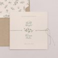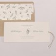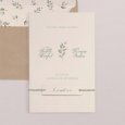 Ce modèle comprend 3 éléments : un faire-part, une carte glissée dans sa pochette interne et une étiquette à attacher sur le devant. Des perforations sont prévues sur le faire-part pour y glisser un joli ruban (au choix et en supplément), agrémenté de l'étiquette.