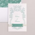 Ce modèle comprend 3 éléments : un faire-part, une carte glissée dans sa pochette interne et une étiquette à attacher sur le devant. Des perforations sont prévues sur le faire-part pour y glisser un joli ruban (au choix et en supplément), agrémenté de l'étiquette.