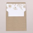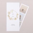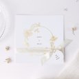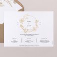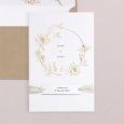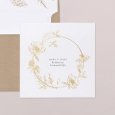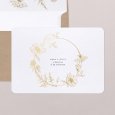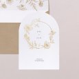 Sur le faire-part de mariage Carmen, une superbe couronne de fleurs esquissée en or encadre les prénoms des jeunes mariés. Une composition raffinée, parfaite pour conter un mariage champêtre, chic ou bohème.