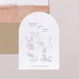 Caractérisé par sa découpe en forme d'alcôve sur la couverture, ce faire-part double volet comprend une carte glissée à l'intérieur.L'ensemble est personnalisable avec les détails de votre évènement.