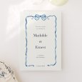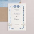 Sur le faire-part de mariage Galon bleu, un délicat ruban aquarellé en bleu s’invite en ornement autour des prénoms des futurs mariés. Une papeterie empreinte d’une délicate poésie, qui donnera déjà le ton d’une union chic.