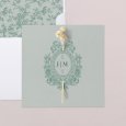 Ce faire-part de mariage se présente sous la forme d'une carte carrée pliée, agrémentée d'une étiquette ronde perforée. Cette dernière pourra être attachée à l'aide d'un ruban (à choisir en supplément). Deux perforations sont prévues sur le recto de la carte pour faire passer le ruban.