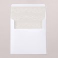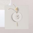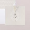 Ce faire-part de mariage se présente sous la forme d'une carte carrée pliée, agrémentée d'une étiquette ronde perforée. Cette dernière pourra être attachée à l'aide d'un ruban (à choisir en supplément). Deux perforations sont prévues sur le recto de la carte pour faire passer le ruban.