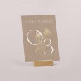 Assorti à votre faire-part, ce numéro de table agrémentera parfaitement votre décoration du jour J. Présentez-le sur un élégant porte-carte en bois (disponible en option), attachez-le à l’aide d’une ficelle autour d’un mason jar en verre garni de fleurs séchées… laissez parler votre imagination !