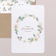 Une sublime couronne de fleurs blanches orne le faire-part de baptême Rosa blanca. Un modèle plein de fraîcheur, parfait pour une cérémonie printanière ou estivale.