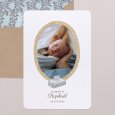 Ce faire-part de baptême présente un format portrait, avec des coins arrondis pour plus de douceur. Il est personnalisable au recto comme au verso.
