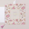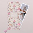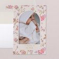 Annoncez le baptême de votre enfant avec élégance et poésie, grâce au faire-part Julietta. Le prénom de votre enfant s'inscrit en lettres dorées, délicatement encadré de motifs floraux aux tons rosés.
